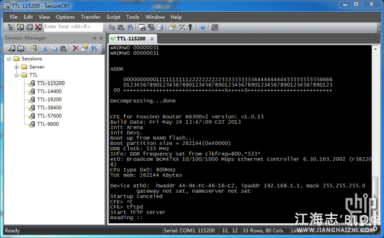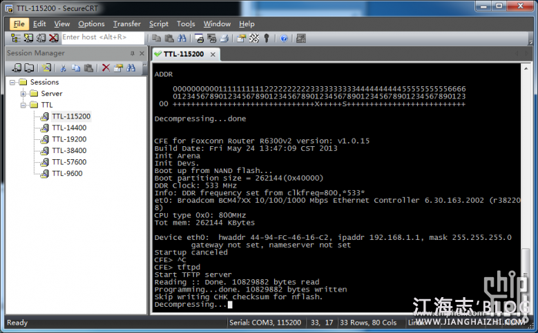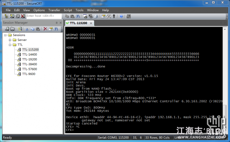 使用超级终端或者SecureCRT连接TTL线,R6300的波特率是115200,连接电磁炉的电源当看到有文字返回,不断按Ctrl+C,终止系统自动启动,让电磁炉处于CFE模式下