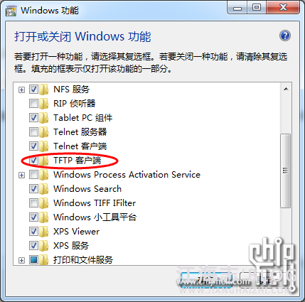 开启过程如下:在控制面板,程序和功能,在左侧的打开或关闭Windows功能中,勾选TFTP客户,点击确定就好。