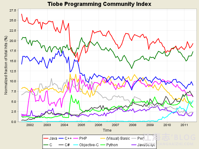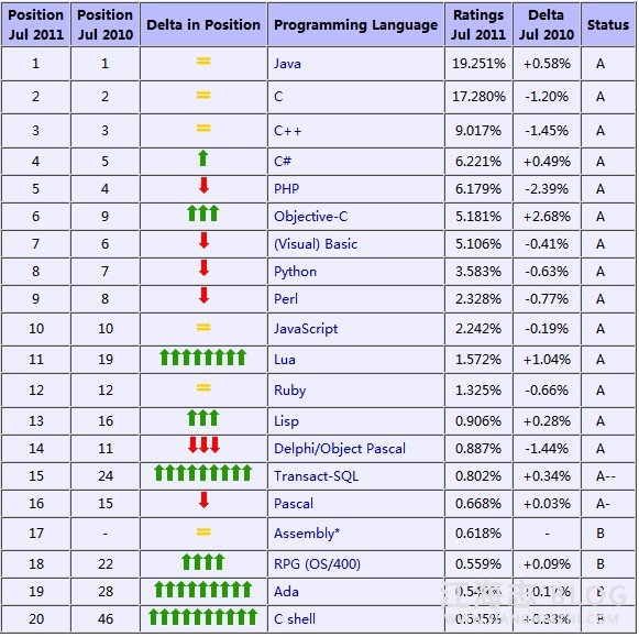2011年已经过去一半,从市场占有率来看,有一种语言脱颖而出,那就是Objective-C,相对2010年增长了2.68%,亚军则是Lua,增长率为1.04% ,如果按这个走势下去,2012年的1月,Lua也将和现在的Objective-C一样,成为年度语言。